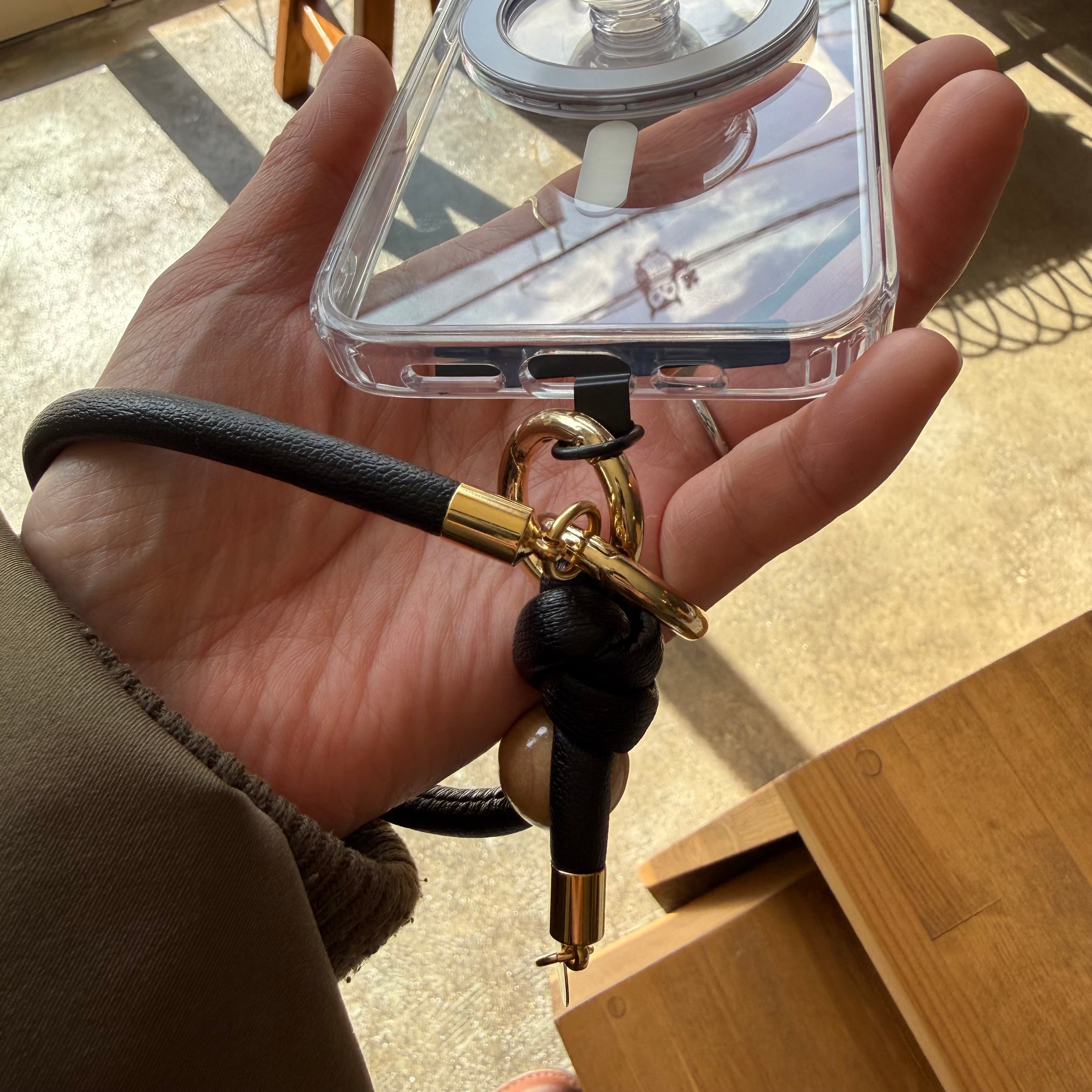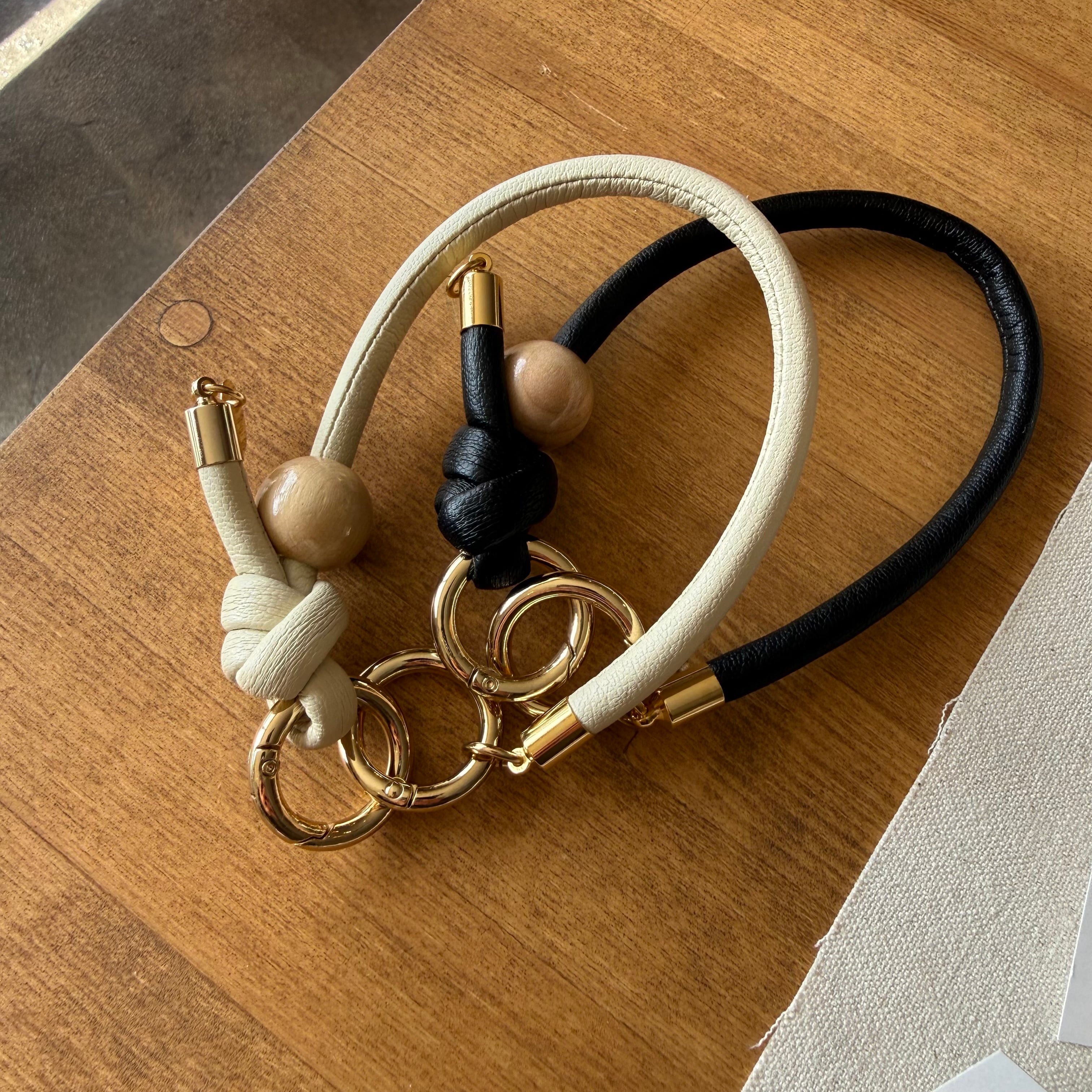 革紐とウッドのハンドストラップ|アイボリー ブラック