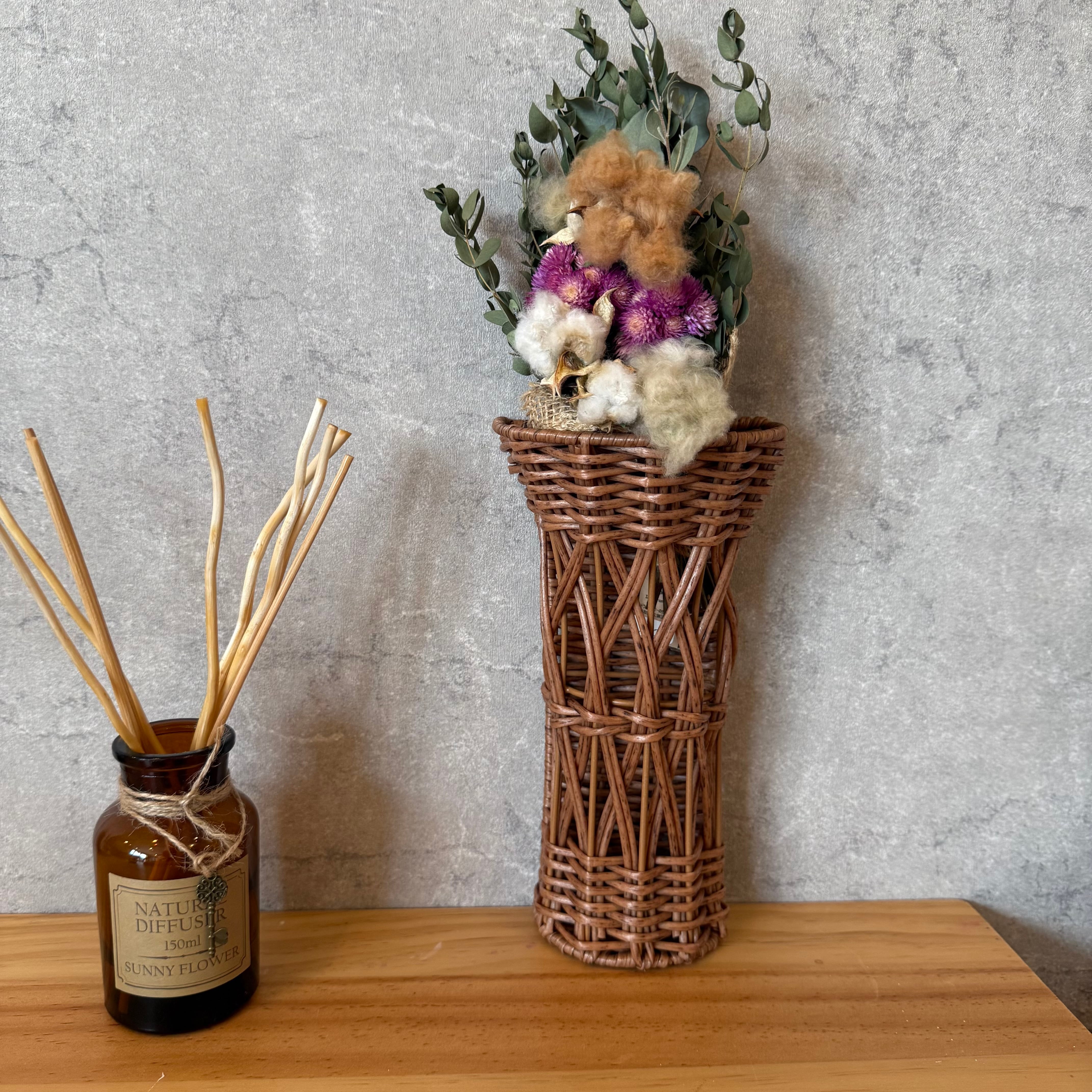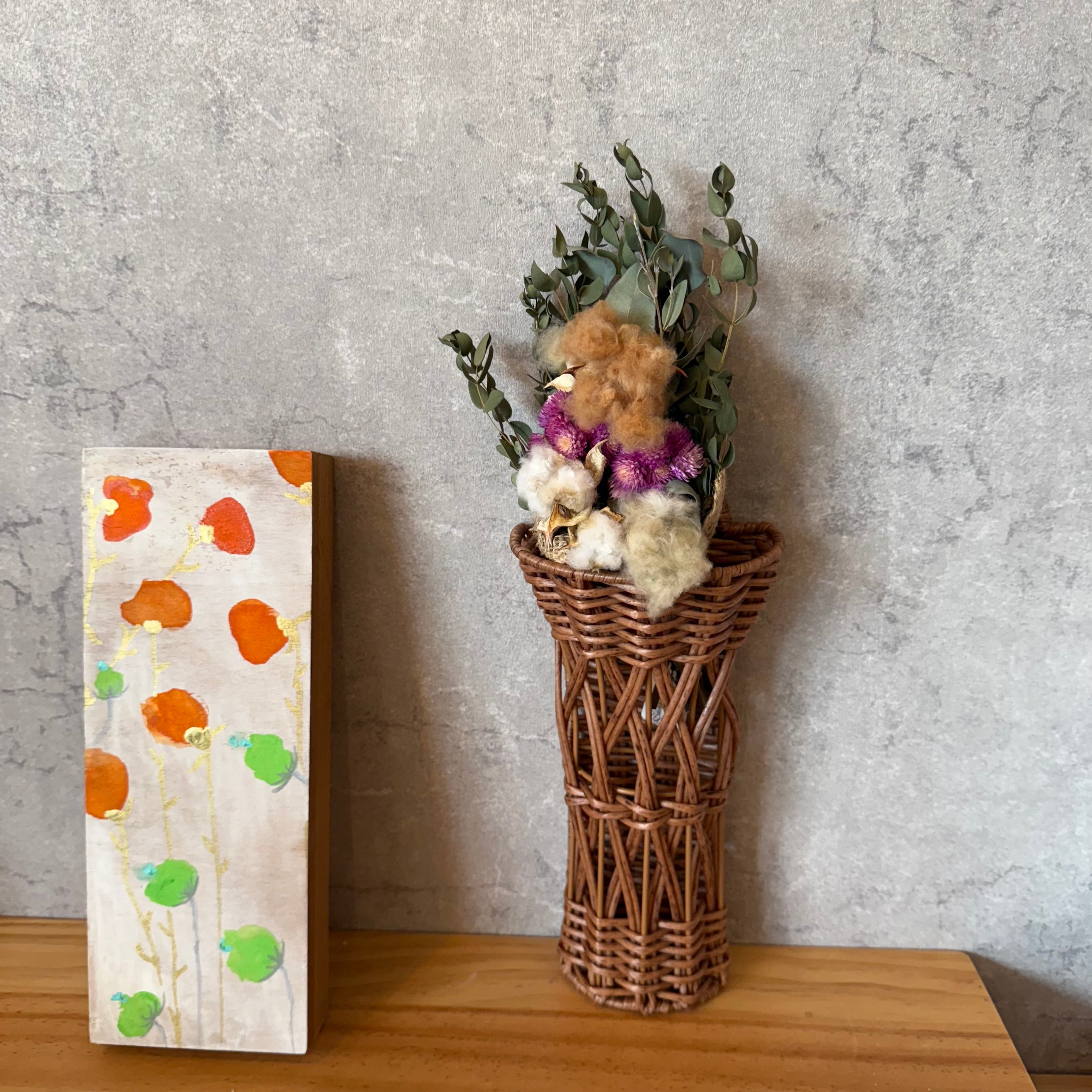 ドライフラワーを飾って、壁に掛けたり、立てかけたり。玄関の靴べら入れとして。