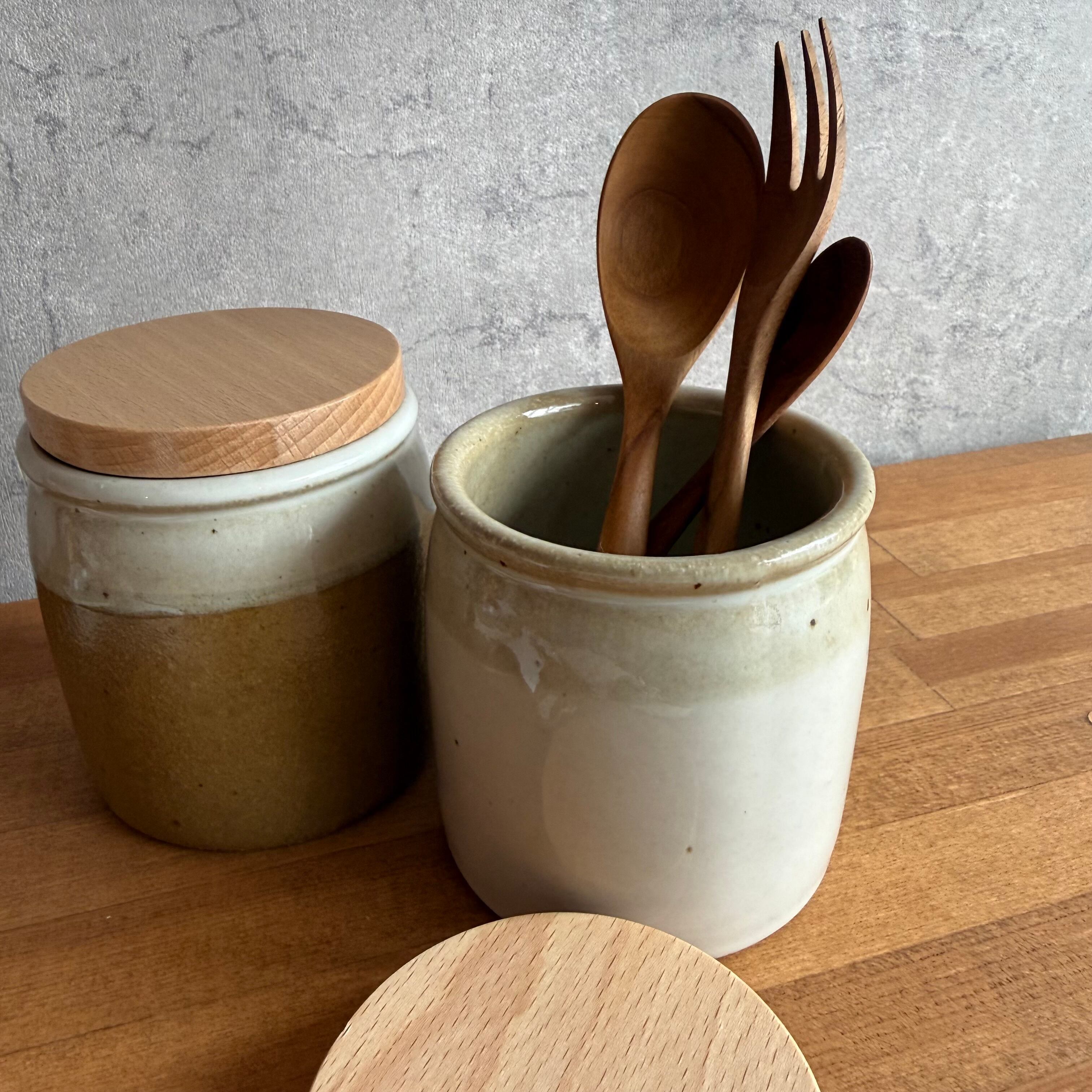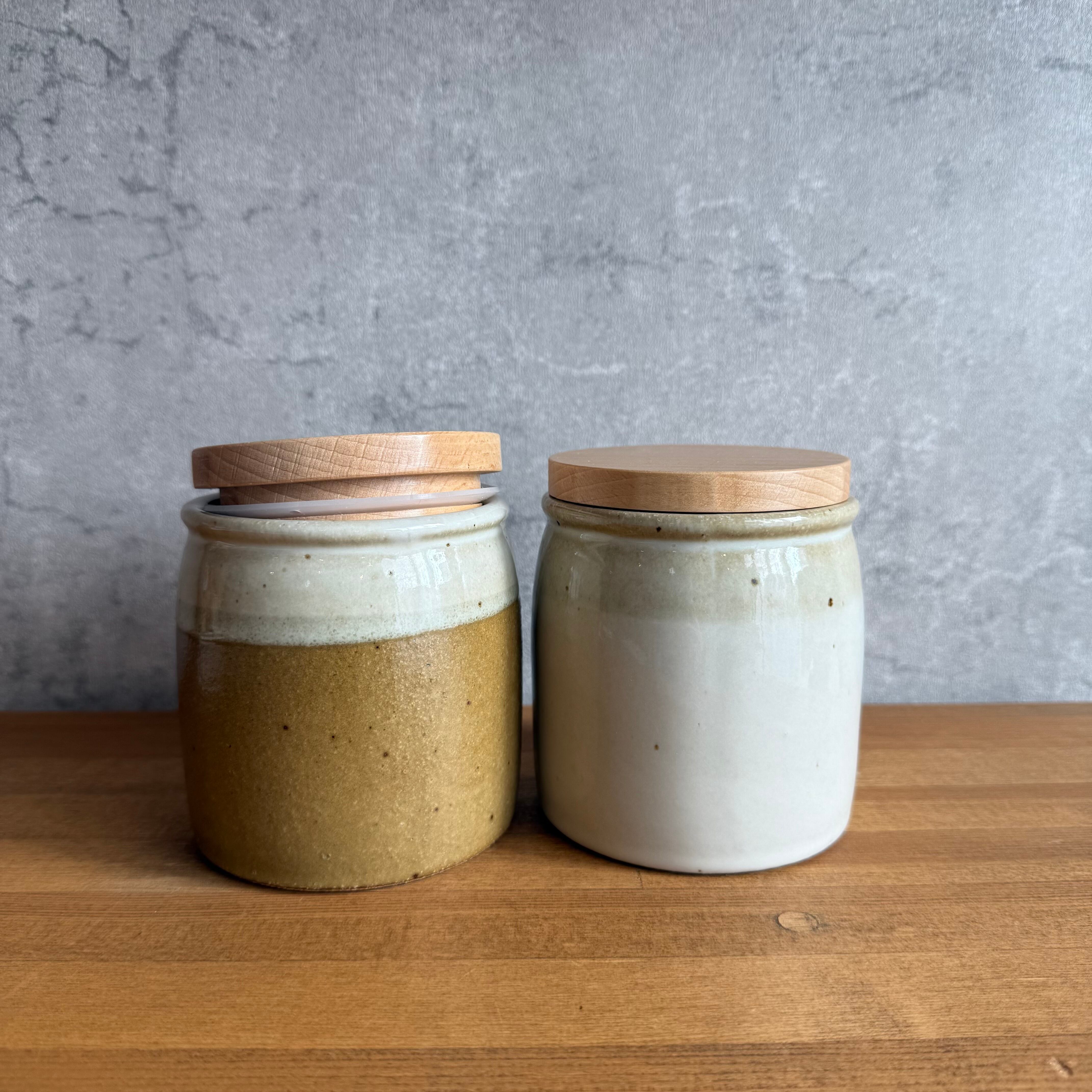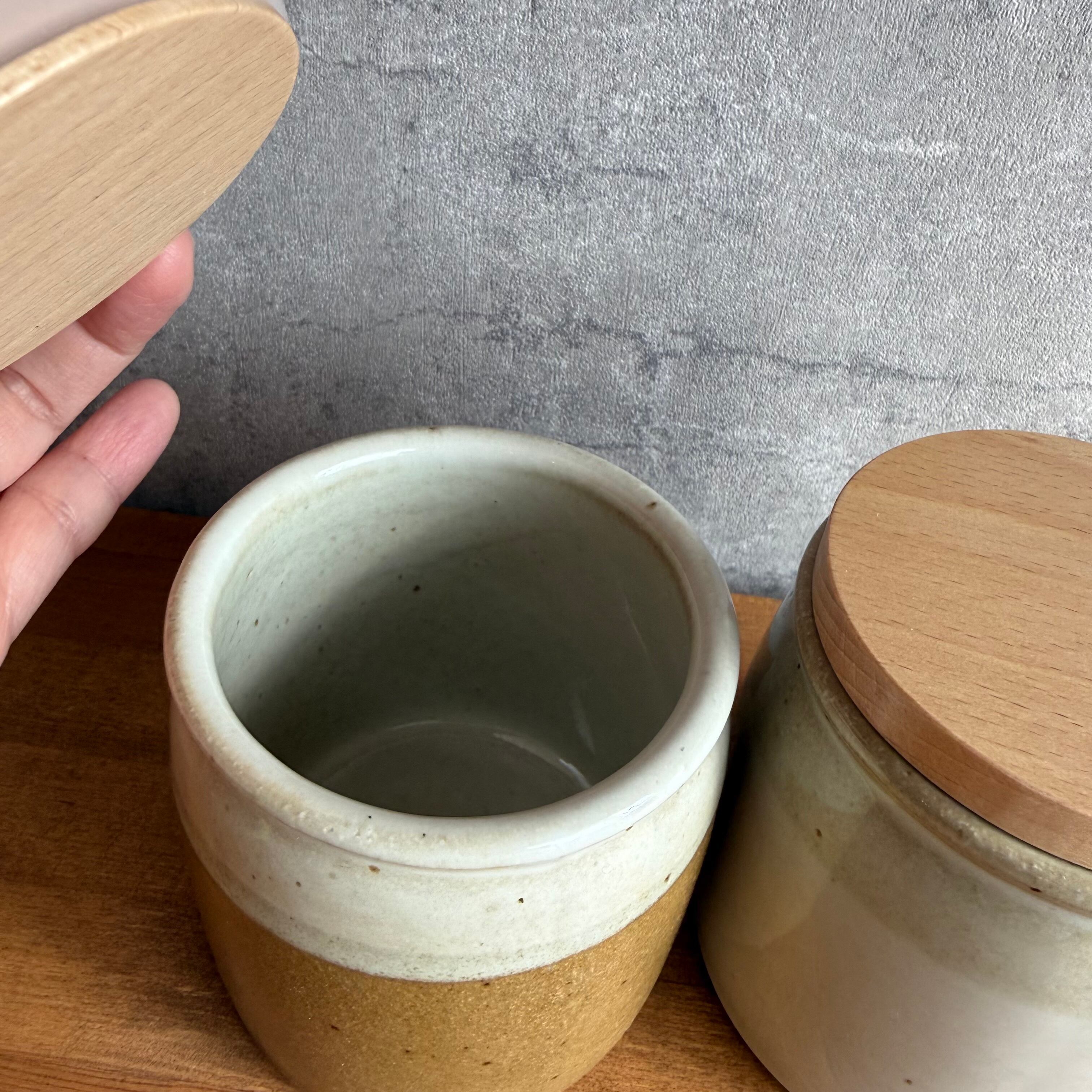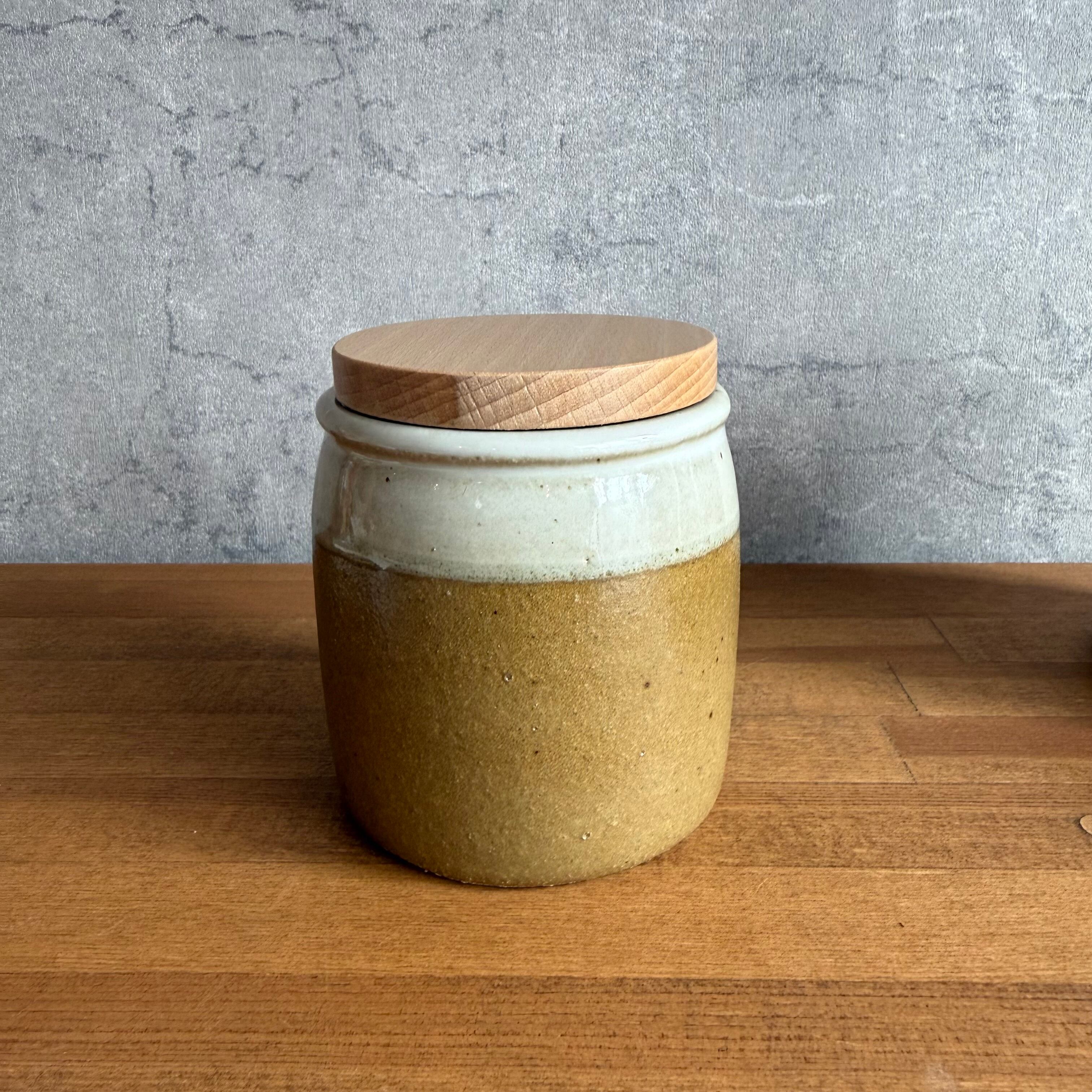 優しい風合いの木蓋に、素朴な陶器を組み合わせたキャニスター