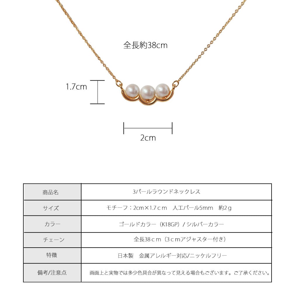 「さりげなく、でもちゃんと素敵。日本製パールネックレス」毎日のコーデに、ちょっとだけ「自分らしさ」をプラスしたいときに。繊細なゴールドチェーンに並ぶ3粒の真珠が、控えめなのに目を引くデザイン。シンプルだからこそ、どんな服にもすっと馴染んで、自然と品よく見せてくれます。自分へのご褒美にも、大切な人へのギフトにもおすすめです。肌に優しいニッケルフリー素材を使用し、金属アレルギーにも配慮。