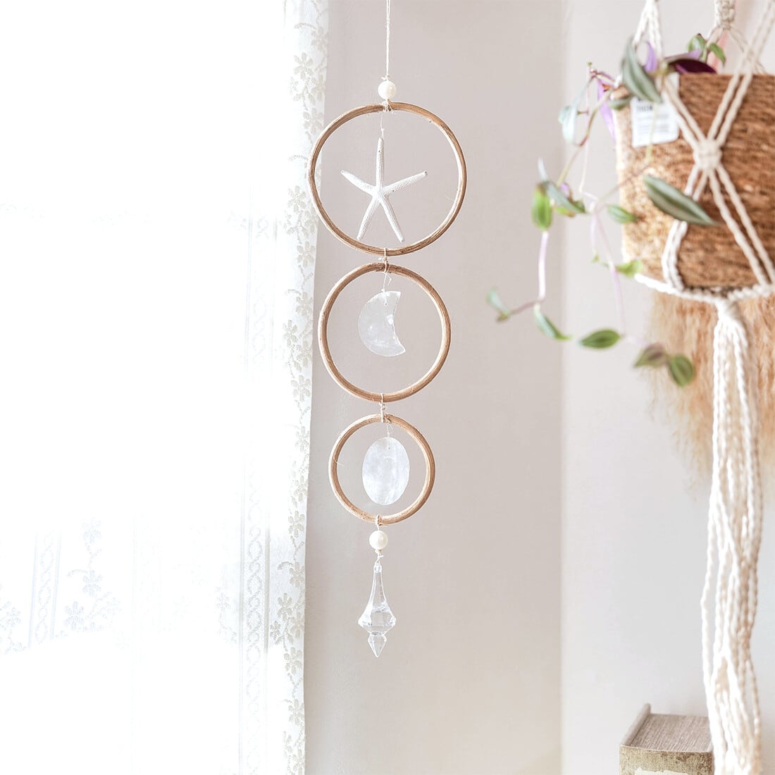 ラタンのリングと、ヒトデやカピスを組み合わせたサンキャッチャー。窓辺に飾れば光を受けてキラキラと輝きます。